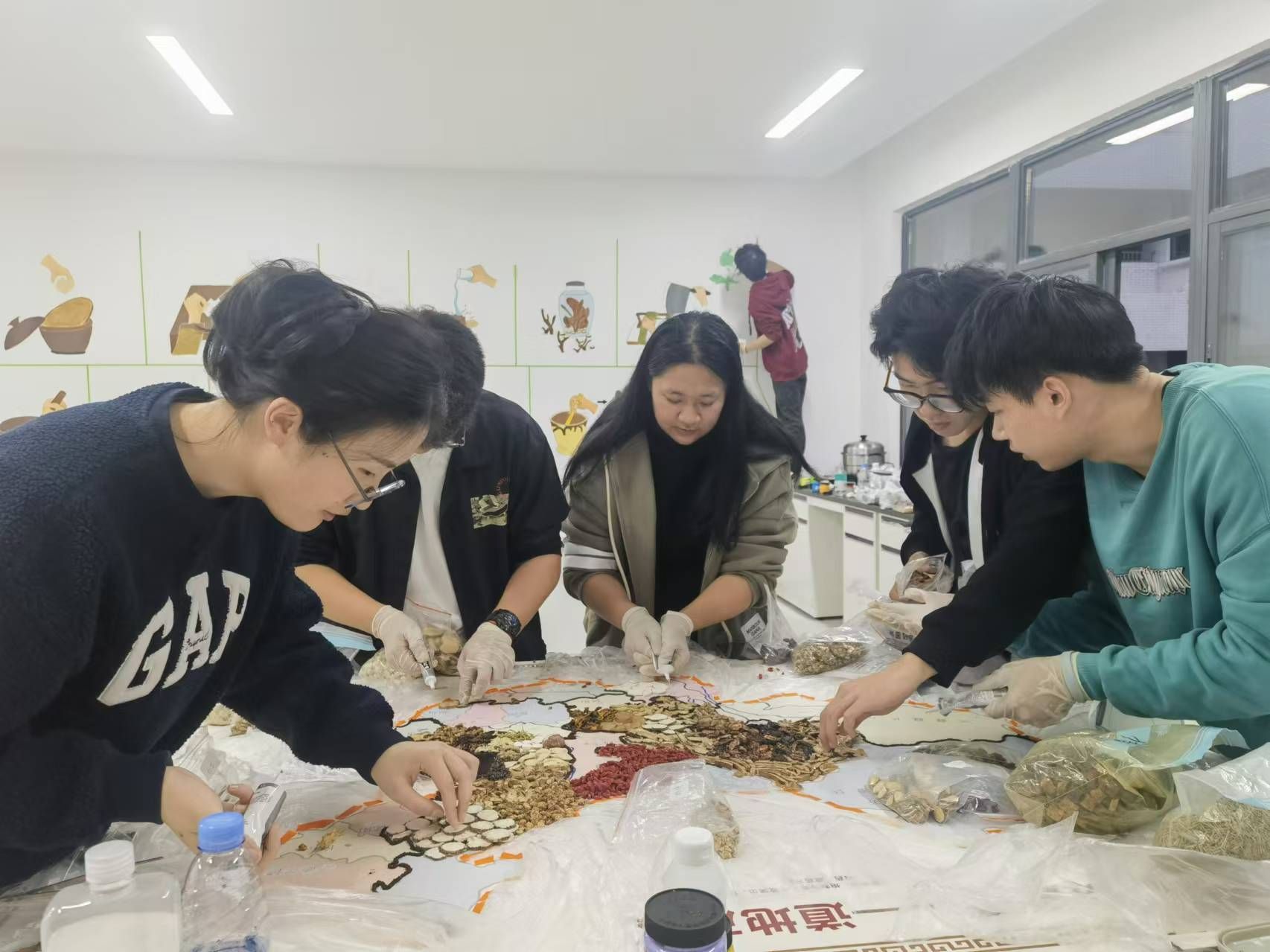 新校区的落成启用,为中医文化建设提供了前所未有的发展机遇。近日,运动医学教学示范中心秘书但柟林老师带领27名本科生(孟芮竹、周璐瑶、于根源、张橙月、解雨欣、徐于涵、吴紫娴、赵云嵩、陆英毅、赵雯萱、刘书豪、常芷洛、马郡娅、宋卓颖、杨涛汇、巢樱曦、郑东昊、吴国梁、杨景焜、李宜航、张凡珂、赵云嵩、李思吾、张维倩)应地制宜,创造性地将中医药元素和艺术相结合,将怀贤楼三楼中医学科实验室打造成一个充满浓厚中医氛围和艺术气息的实验实践与创意学习空间。
