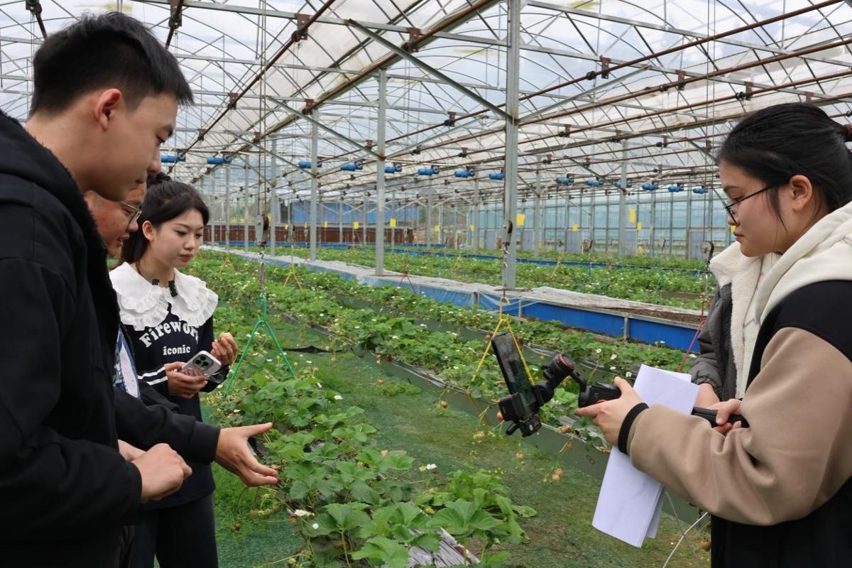 调研中,同学们深入田间地头,围绕产业发展、文化传承、集体经济建设等方面开展实践活动。学生们在老师的指导下,充分发挥专业特长,以融媒体为媒介,扩宽传播渠道,通过抖音、微信视频号平台传播乡村文化,推广草莓、蓝莓、羊肚菌手工高架面等特色农产品,助力菜子村加强“三品建设”。