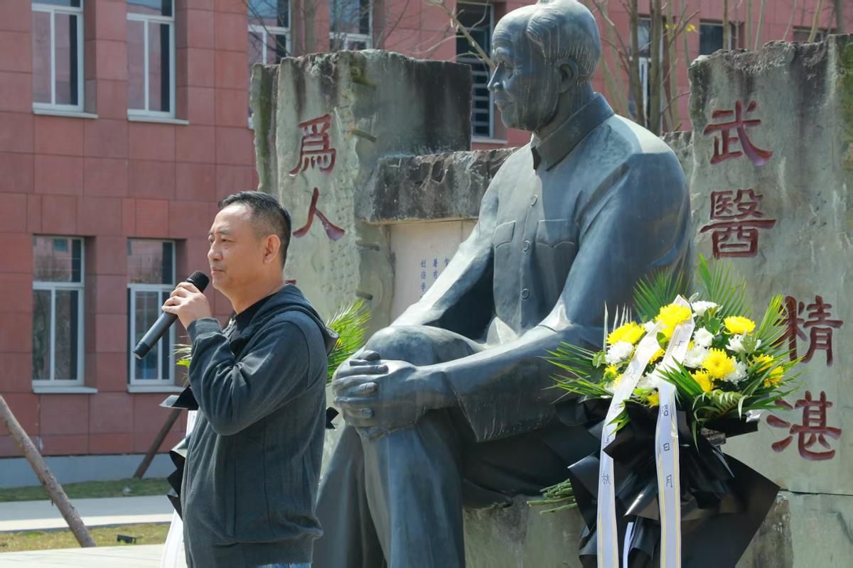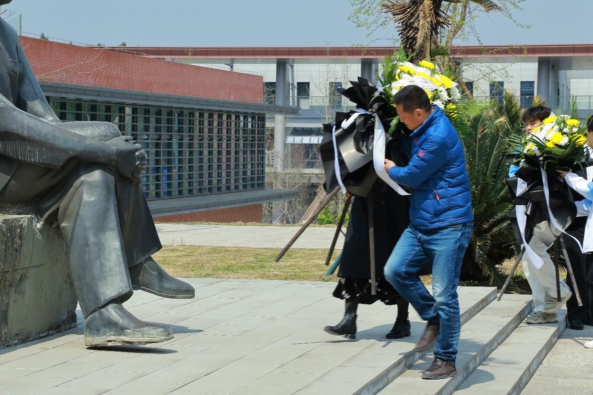 随后,师生代表依次走上前来,向郑怀贤先生的雕像敬献花篮与素菊,并深深鞠躬致意,以此寄托对先生的无尽哀思和缅怀之情。花篮与素菊的芬芳,与师生们内心的敬意交织在一起,共同构成了对郑老最真挚的祭奠。