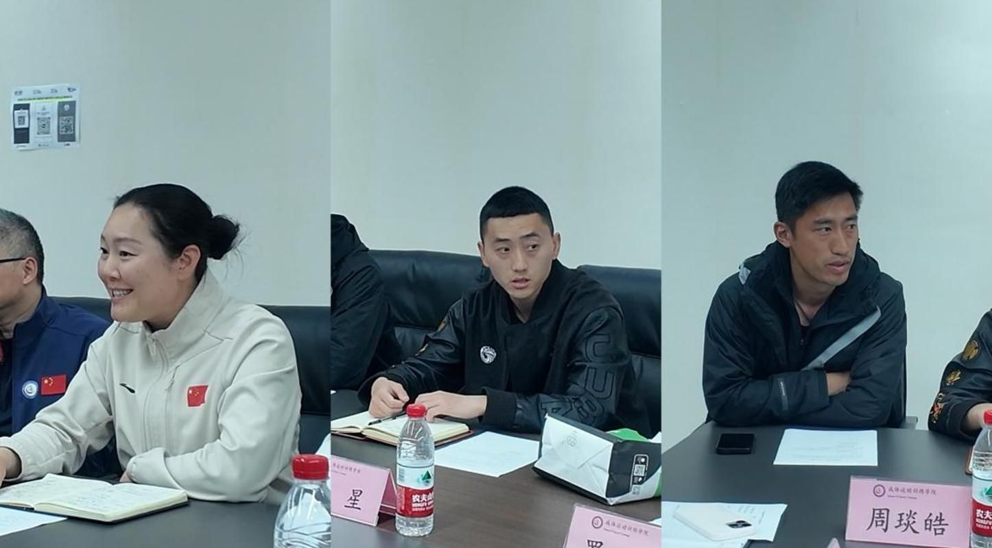 2025年4月8日中午,运动训练学院在网球馆二楼会议室举行了“躬行实践展风采,聚能启航新征程”2021级实习座谈会。学院党委书记彭健、院长杨成波、党委副书记朱勇、副院长罗勇,乒羽教研室教师孔明敏、优秀实习指导教师刘星,板网国家队主教练周琰皓出席,2021级实习生、2022级学生代表参加,会议由本科生管理第四办公室主任凡铁龙主持。