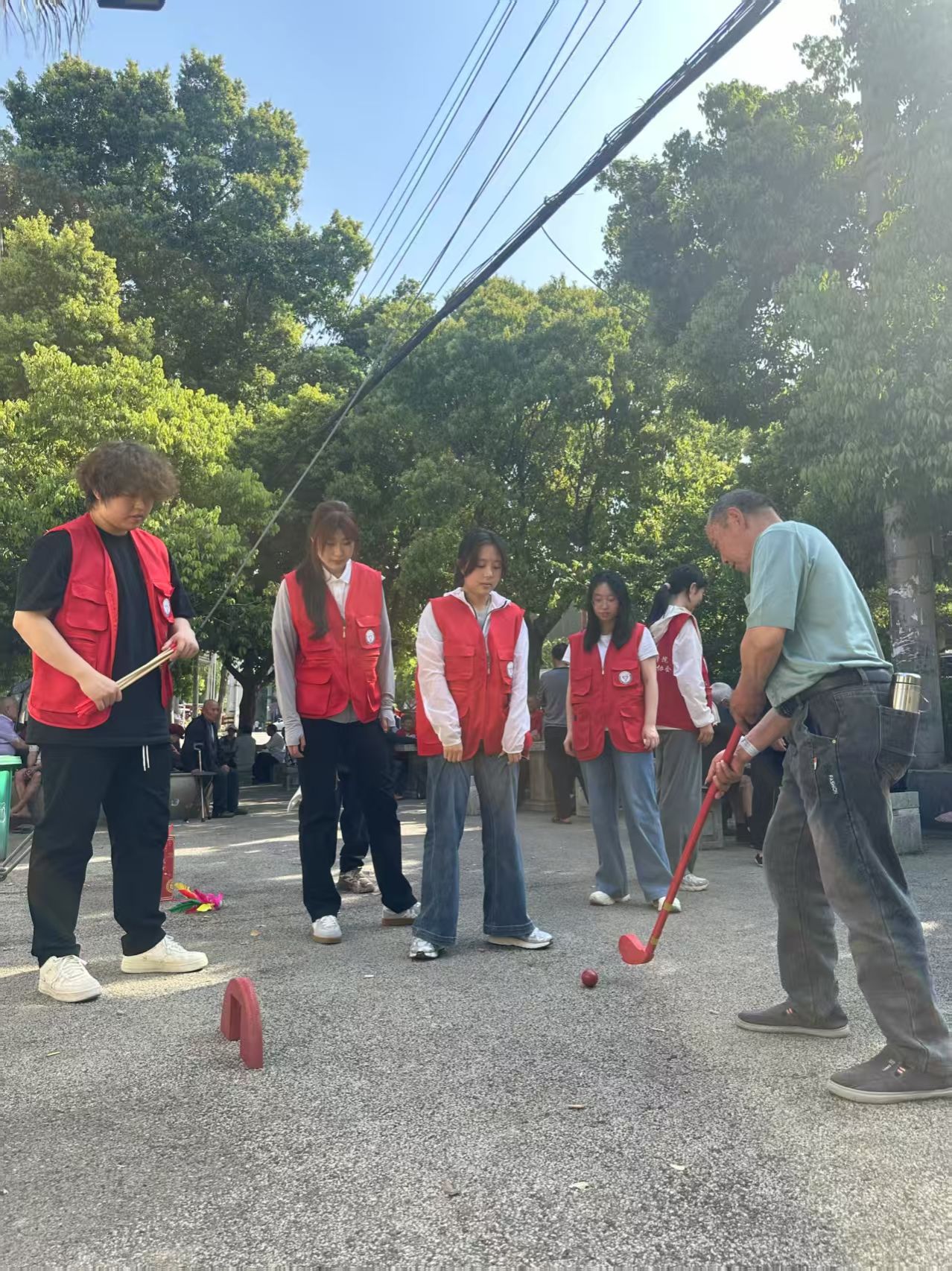 “投壶曾是春秋战国的‘外交礼仪’,捶丸在宋代被称为‘步打球’,堪称古代高尔夫”,在传统项目教学环节中,学生王镁稀用生动的历史故事串联起传统体育的演变脉络。现场还设置了互动问答,居民争相抢答“木射红柱上的五德”“毽子起源朝代”等问题,赢取手绘传统体育主题书签。示范环节中,志愿者展示了毽子“苏秦背剑”“鸳鸯拐”等高难度动作,引得围观居民连连喝彩。