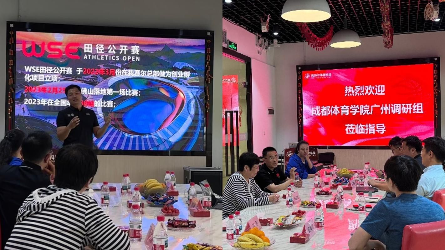 随后的座谈交流会上,公司总裁黄先友先生全面介绍了企业的发展历程、发展规模以及教学理念。他着重阐述了公司的核心文化——“赛文化和精英文化”,强调通过赛事激发青少年的斗志,助力孩子们塑造健康体魄。辛腾圳先生随后聚焦公司主打赛事《街3少年篮球公开赛》,分享了篮球培训与赛事发展成果,展现了公司在青少年篮球领域的专业与创新。公司董事长莫冬科先生则对WSE田径公开赛进行了详细介绍,特别提到该赛事作为中国第一个出海赛事IP,在推动田径赛事商业化进程中发挥的重要作用。