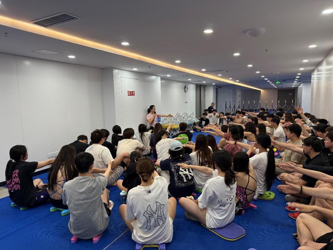 郑嘉教练首先对我国花样游泳发展史、发展现状、未来发展作了介绍;在互动环节中,与同学们就基层教练员短缺问题展开深入交流;最后结合万象城游泳主修学生的实际情况,介绍了花样游泳陆上节奏练习的方法和水中基本动作的练习方法,并组织学生进行实践练习。