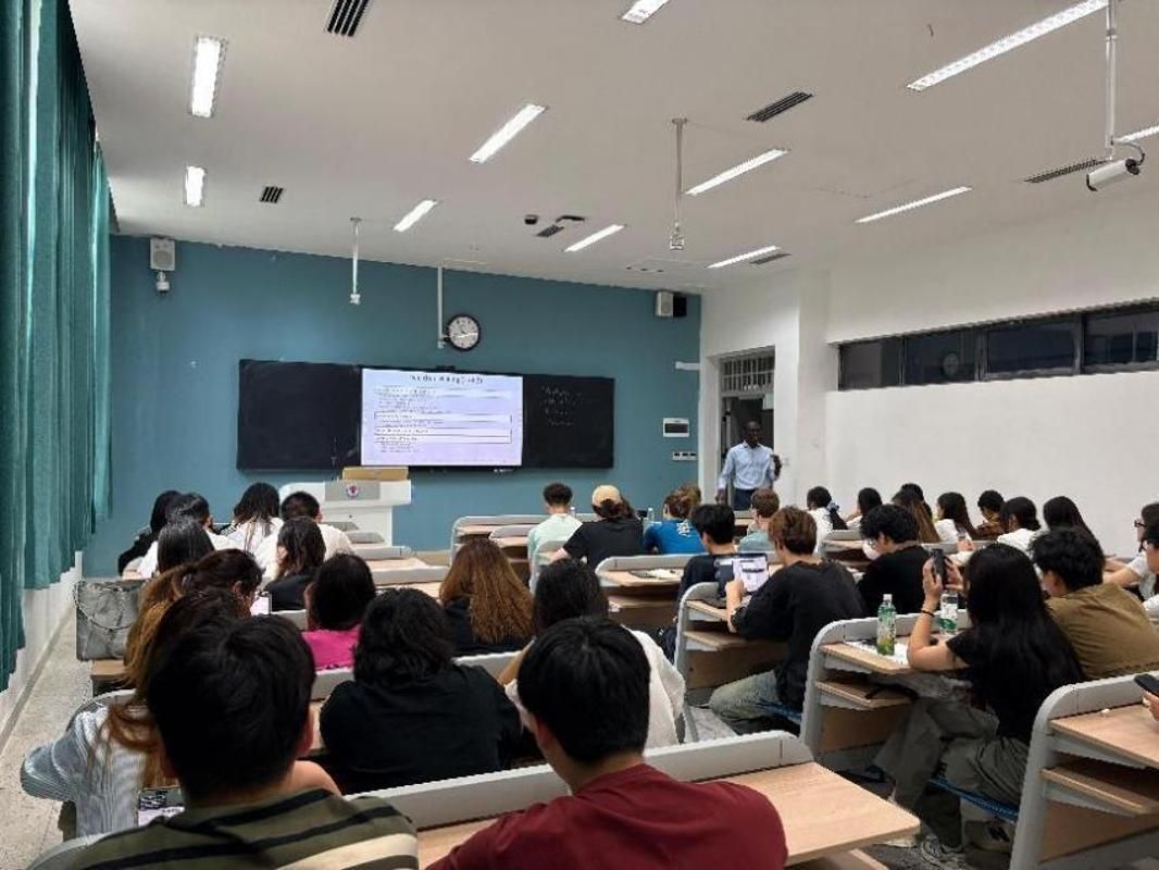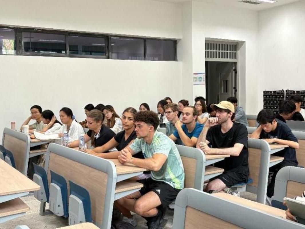 5月23日上午,法国洛林大学师生代表到万象城访问,并来到经济管理学院2024级体育经济与管理(中外合作办学)专业外教课堂开展交流。