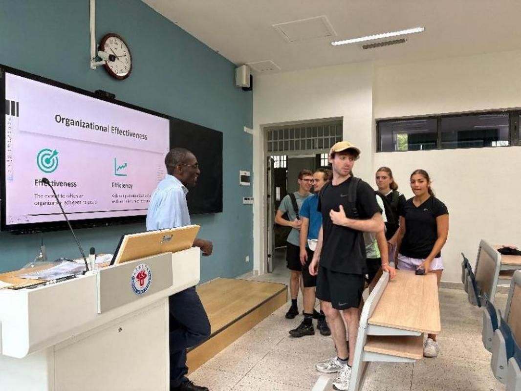 洛林大学师生与我院学生一起学习了外教老师Gerard Adedjoumon Akindes讲授的《体育管理的原理与应用》课程内容,感受了课堂氛围和教学环境。随后,两校师生就课程相关知识展开交流,双方在问答中碰撞出新的思考。洛林大学师生还了解了我院的办学情况和其他课程内容,同时向我方介绍了洛林大学的校园环境和课程体系。