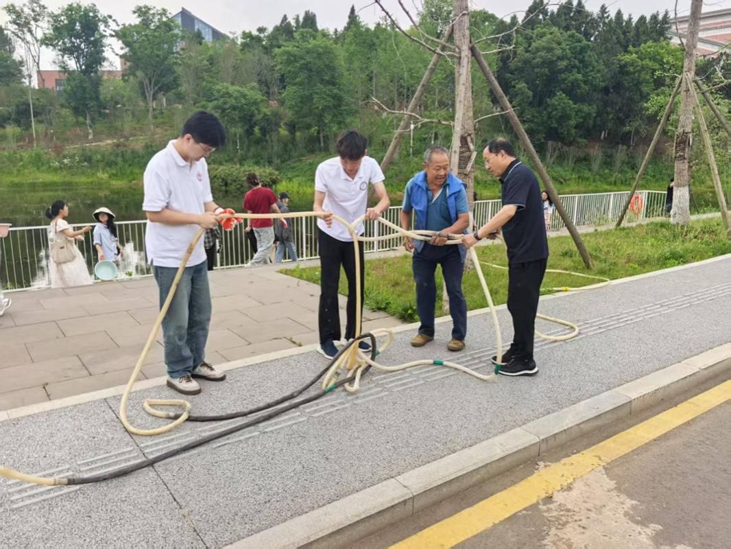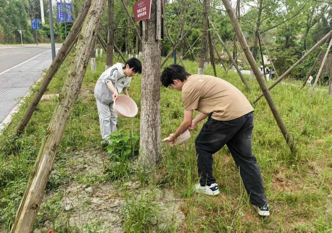 活动现场,学生们分组协作,分工明确,在湖岸边,同学们手持水桶、水管,前去灌溉草木,在另一旁的道路上,同学们手持垃圾袋,轻轻拾起草坪中的塑料瓶、纸屑等垃圾。当汗湿的后背映着清晨阳光,原本杂乱的绿化带重现干净整洁,劳动教育的深意已悄然扎根在沾满草屑的运动鞋与磨红的手掌纹路之间。