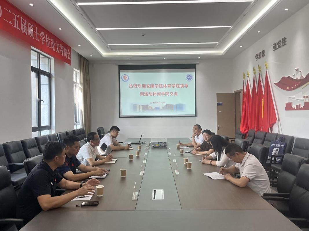 2025 年 6月12日,安顺学院体育学院一行到运动休闲学院开展交流活动,院长曾洪林、副院长蒋书君、社会体育指导与管理系及院办等老师参会。会议由副院长蒋书君主持。