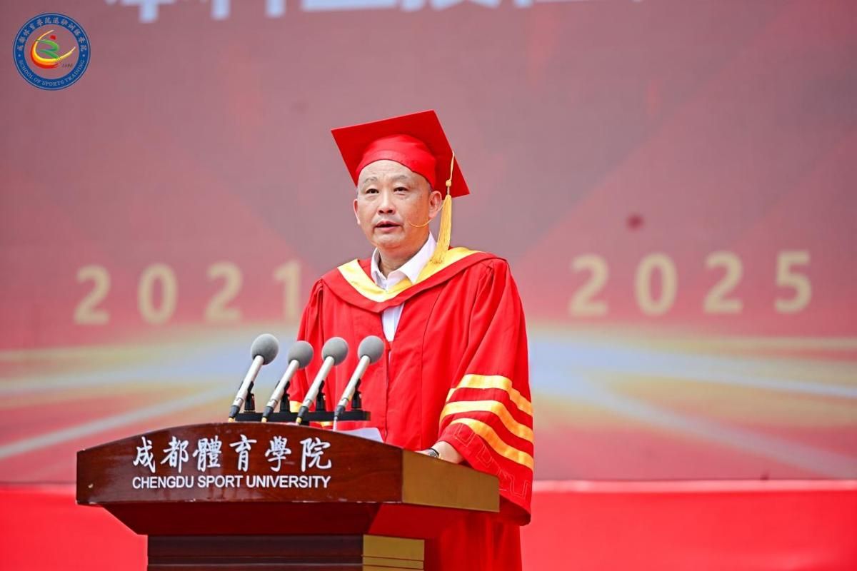 运动训练学院杨成波回顾了学院在竞技体育人才培养和学科建设上的突出成果,充分肯定毕业生们践行“笃训卓竞 业精技专”的专业精神。他寄语学子:“人生没有无法翻越的火焰山!前路纵有坎坷,只要信念不熄、斗志不垮,必能登临绝顶。望你们以‘一勤天下无难事’的狠劲拼搏,在更广阔的人生赛场上续写成体人的奋进诗篇!”