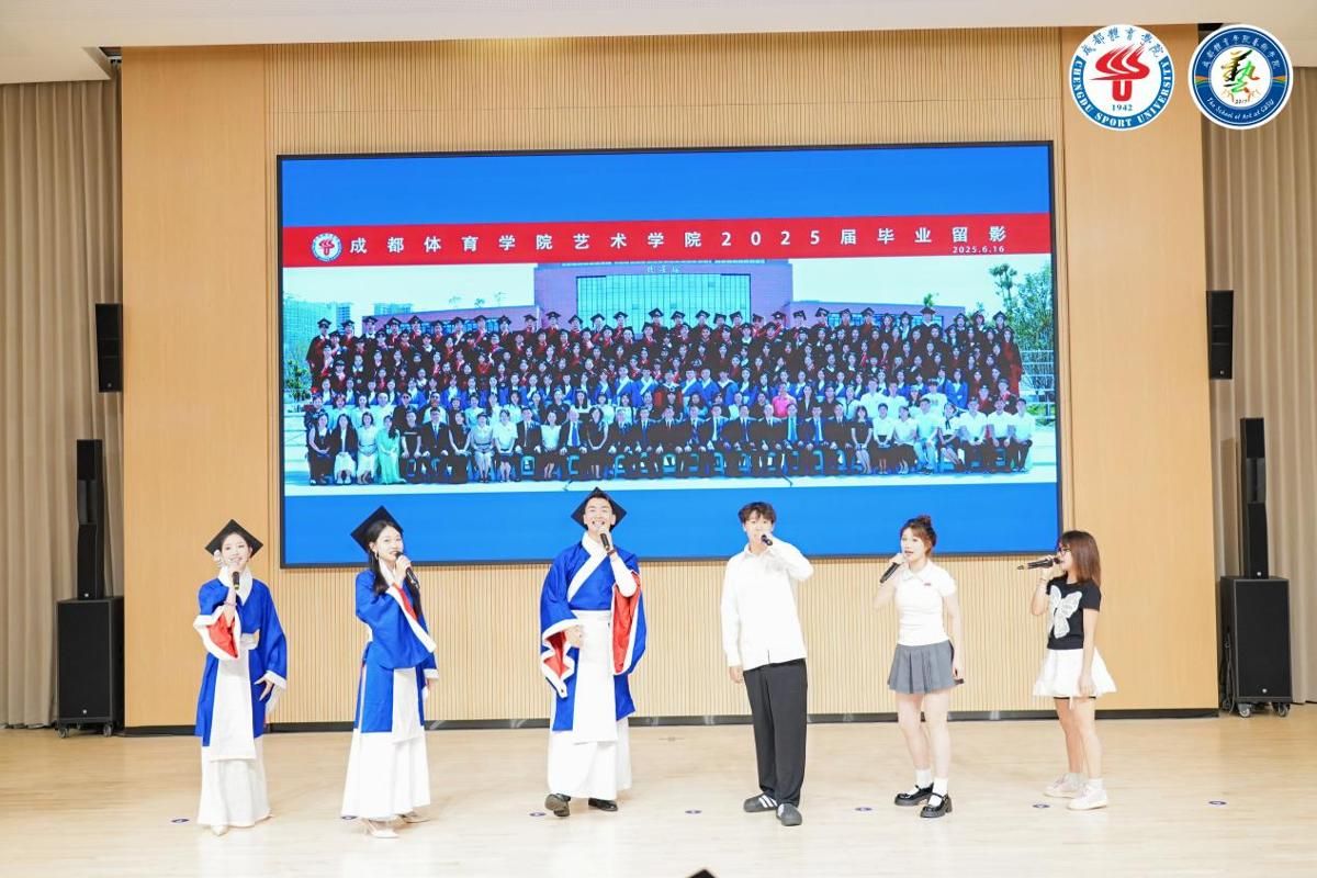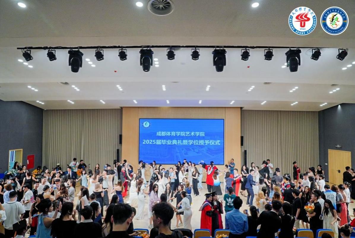 随着《再见——从体院路2号相遇,到环湖北路1942号告别》毕业视频的播放完毕,艺术学院2025届学生毕业典礼暨学位授予仪式圆满结束,整场仪式由学院副院长方奇主持。随后,现场进入到热闹非凡的舞会和师生同唱环节,现场气氛推向高潮。