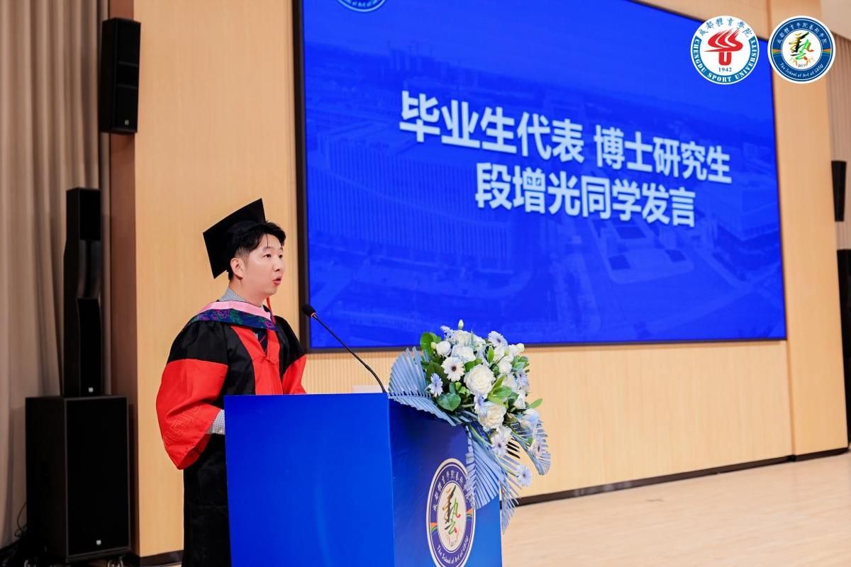 毕业生代表、博士研究生段增光以“深耕者”“接续者”“修行者”勉励同窗,感恩母校培养,呼吁大家德艺双馨、艺体融合、知行合一,共赴新征程。