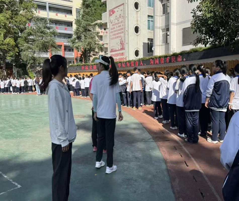 在峨边中学,6名支教老师以课间跑操为切入点,融入校园日常。他们身着统一运动服,精神饱满地站在队伍前方,伴着音乐带领学生跑步。老师们一边喊口号鼓励学生调整姿势和节奏,一边留意队伍情况,及时提醒步频、鼓励体力不佳的同学。整个跑操过程秩序井然,学生们表现积极,成为校园中一道充满活力的风景线。