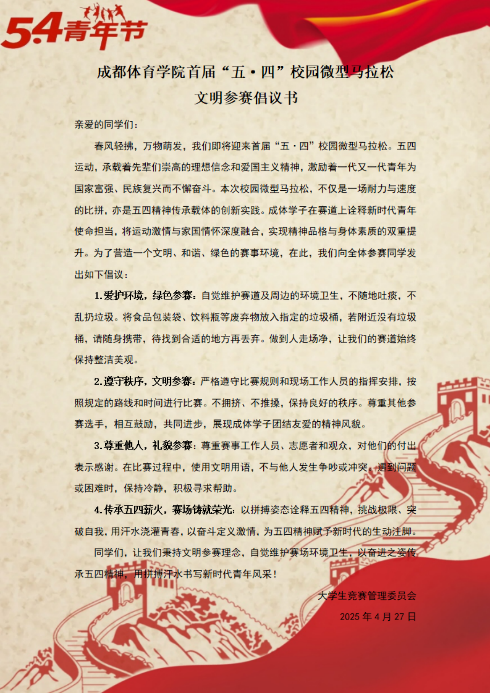 allwincity万象城官方网站首届“五·四”校园微型马拉松文明参赛倡议书