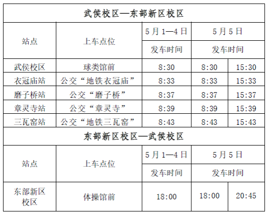 劳动节期间交通车仅运行南1线,5月1日—5月4日每日运行1班,5月5日运行2班,具体见下表: