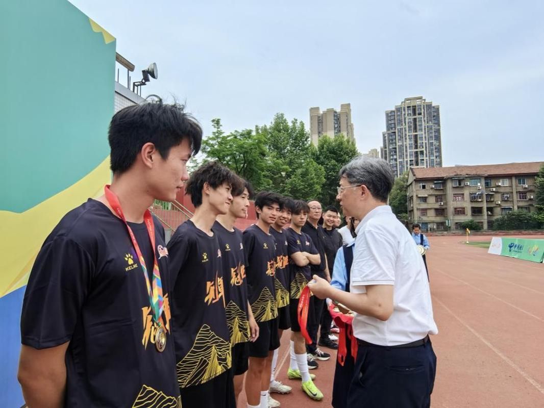 学校党委常委、副校长李林到四川大学客场为队员们加油助威,并在赛后的颁奖环节,亲自为队员和教练团队颁发象征荣誉的冠军奖牌。
