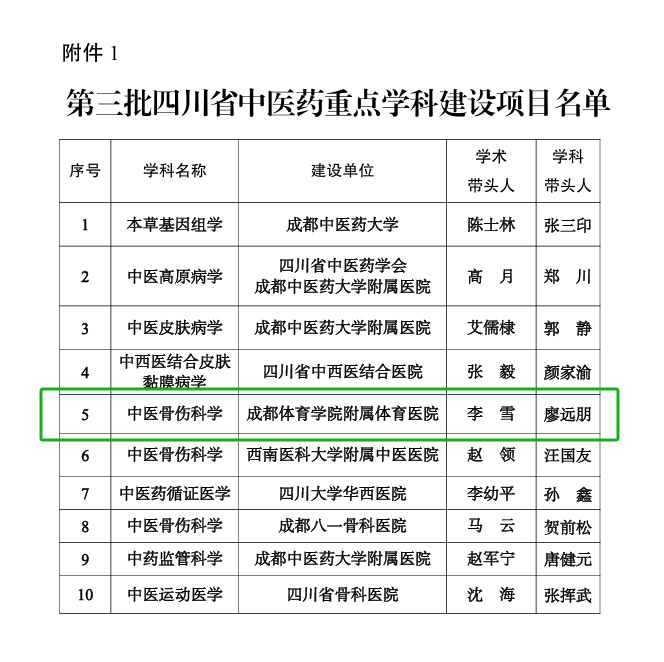 5月13日,四川省中医药管理局发布《关于公布第三批四川省中医药重点学科建设项目和培育项目的通知》(川中医药办函〔2025〕15号),附属体育医院牵头申报的中医骨伤科学成功获批省中医药重点学科建设项目。