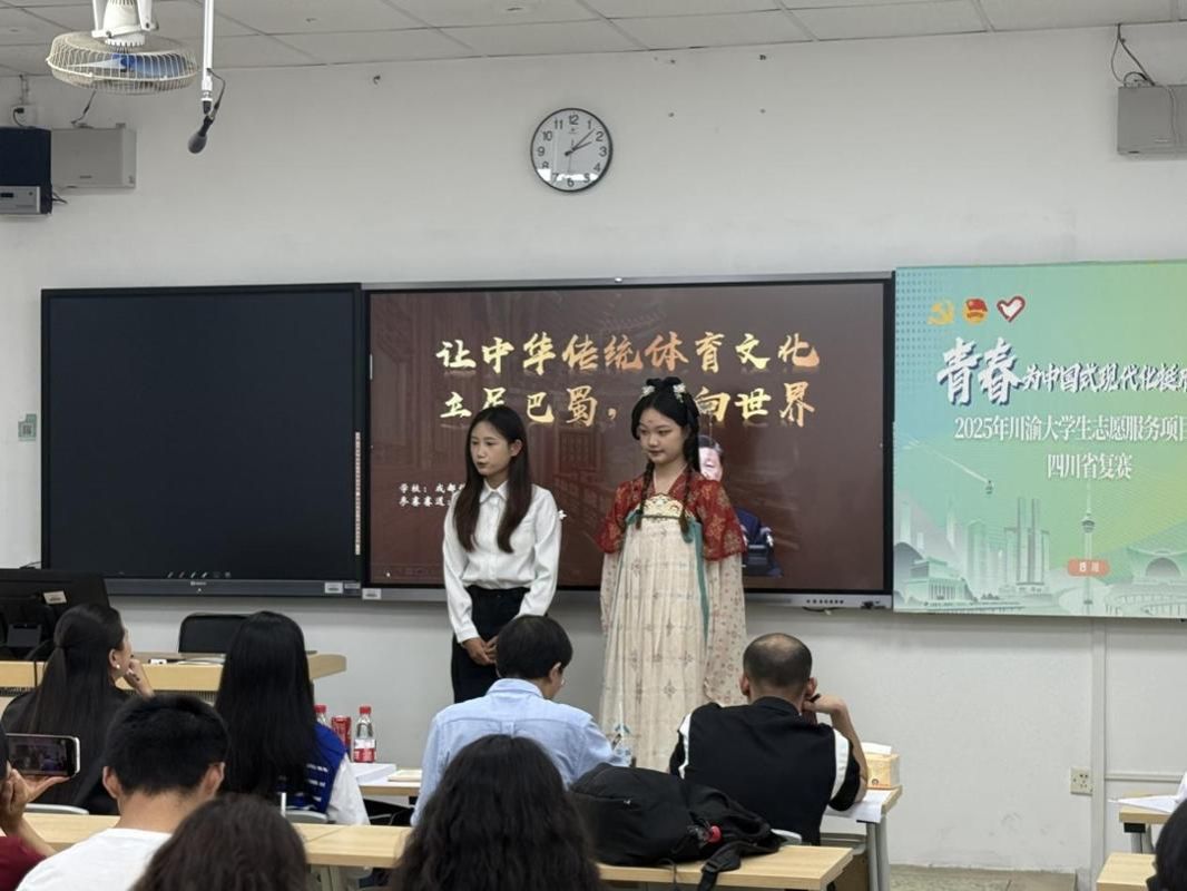 本次大赛自四月启动以来,学校团委紧扣“以赛促建、以赛育人”目标,广泛发动全校21支特色志愿服务团队参与。从社区服务到文化传承,从心理健康到体育赋能,各团队以“专业+志愿”的双轮驱动,历经校赛初筛、省级复赛的层层打磨,最终历史文化学院《古韵动九州》项目突破重围闯入决赛。6月12日,由其团总支书记、指导教师萨捷带队赴渝参赛,在终审答辩中以“传统体育活态传承”的创新理念与扎实的实践成果,从90强中突围斩获银奖。