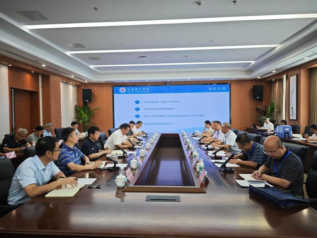 调研会上,付东副校长向来校的专家们表示了热烈欢迎和诚挚感谢,希望专家组为学校实验室安全工作把脉问诊,提出宝贵意见和建议,促进学校进一步提升实验室安全管理水平。专家组组长、四川农业大学生命科学学院副院长徐怀亮教授介绍了省高校实验室安全工作调研组的调研程序和调研工作的重点任务、具体分工和目标要求。专家组听取了教务处/实验管理处副处长晁永鹏关于学校实验室安全管理工作开展情况的汇报。