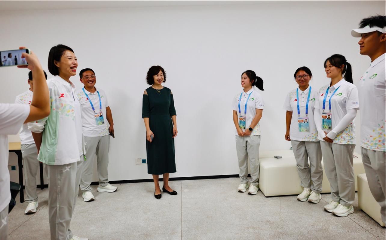 慰问现场,邬校长特别关心高温天气下志愿者的工作时长和身体状况,详细询问了防暑降温措施落实情况,并与场馆中心志愿者保障团队沟通确定在志愿者之家增加藿香正气水等医药物品,保障同学们的健康。她勉励小青椒们:“在国际赛事平台上,你们不仅代表成体青年,更承载中国青年的形象使命。要以精准服务传递中国热情,以责任担当完成志愿服务。”