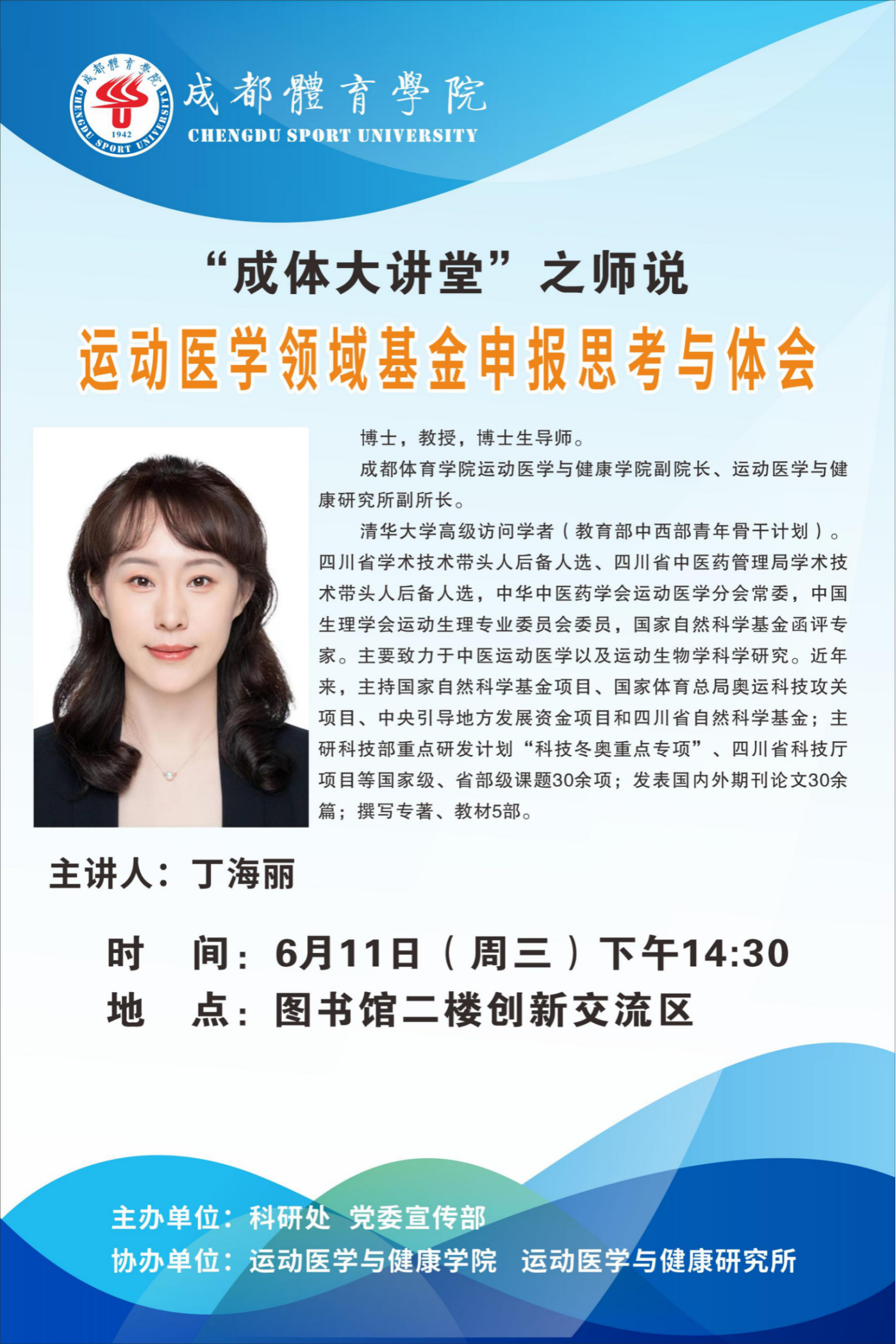 学校将于2025年6月11日(周三)下午14:30在图书馆二楼创新交流区举行“成体大讲堂”科研讲座系列活动之师说。本次讲座特邀运动医学与健康学院副院长丁海丽教授主讲。题目为:《运动医学领域基金申报思考与体会》。欢迎全校师生积极参加。