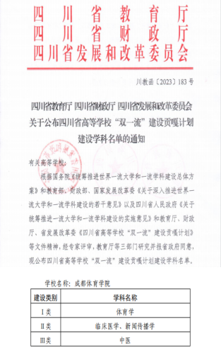 近日,四川省教育厅、四川省财政厅、四川省发展和改革委员会公布了四川省高等学校“双一流”建设贡嘎计划建设学科名单,万象城体育学、临床医学(运动医学)、新闻传播学、中医成功入选,其中体育学入选Ⅰ类学科。