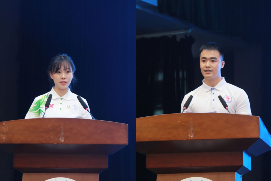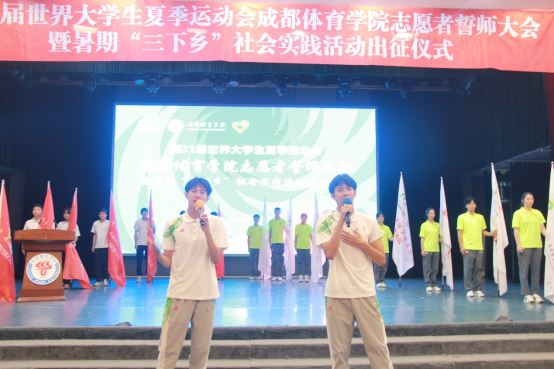 大运会志愿者代表胡麟与三下乡志愿者代表艺术学院实践团刘瀛作表态发言,号召同学们:克服高温、假期等重重困难,弘扬志愿者精神,以饱满的精神积极参与到志愿服务中去,到田间地头受教育、长才干、做贡献,向世界展现成体青年的青春风采。