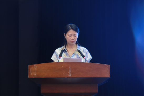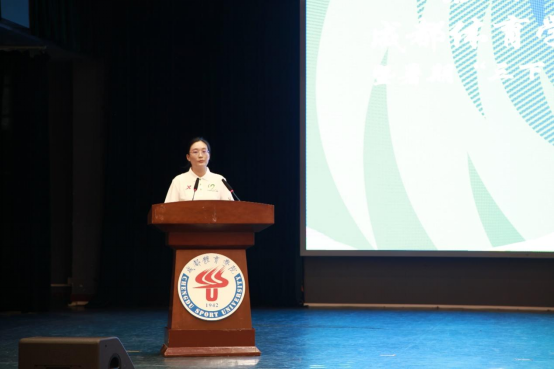 大运会志愿者领队代表——体育教育学院王晶晶老师发言,希望全体志愿者在实践中充分发挥成体学子的专业技能,发扬志愿者精神,认真完成每一项志愿服务任务。