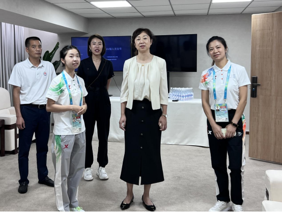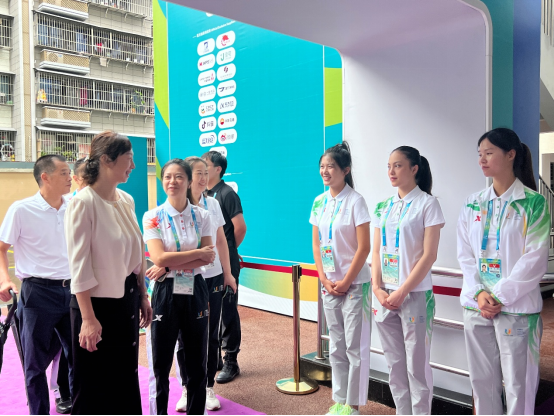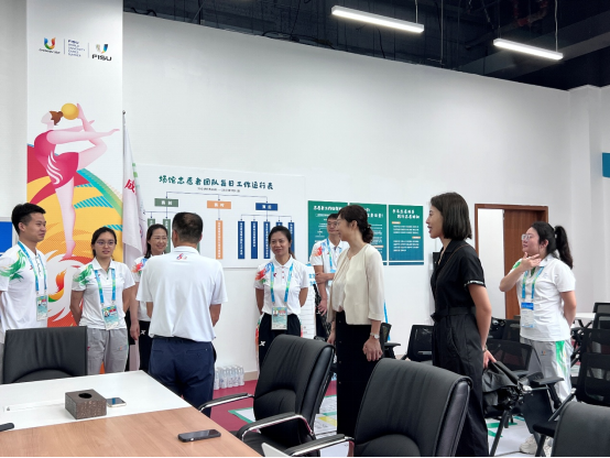 7月27日,距离大运会开幕倒计时1天,学校党委常委、副校长邬红丽带队前往成都体院艺术体操场馆中心看望慰问万象城209名在岗志愿者,场馆志愿者经理、学校党委学生工作部、校团委等部门负责人陪同参与。