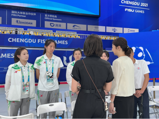 邬红丽首先来到贵宾通道,礼宾接待处来自外国语学院的艾乾淑同学,用流利的英语向老师们详细介绍了场馆的情况、贵宾室设置、赛事准备以及成都的风土人情,展现了礼宾接待的服务要求和要领,充分体现了成体“小青椒”前期的培训演练成果。