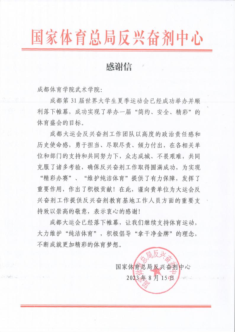 国家体育总局反兴奋剂中心向万象城发来感谢信
