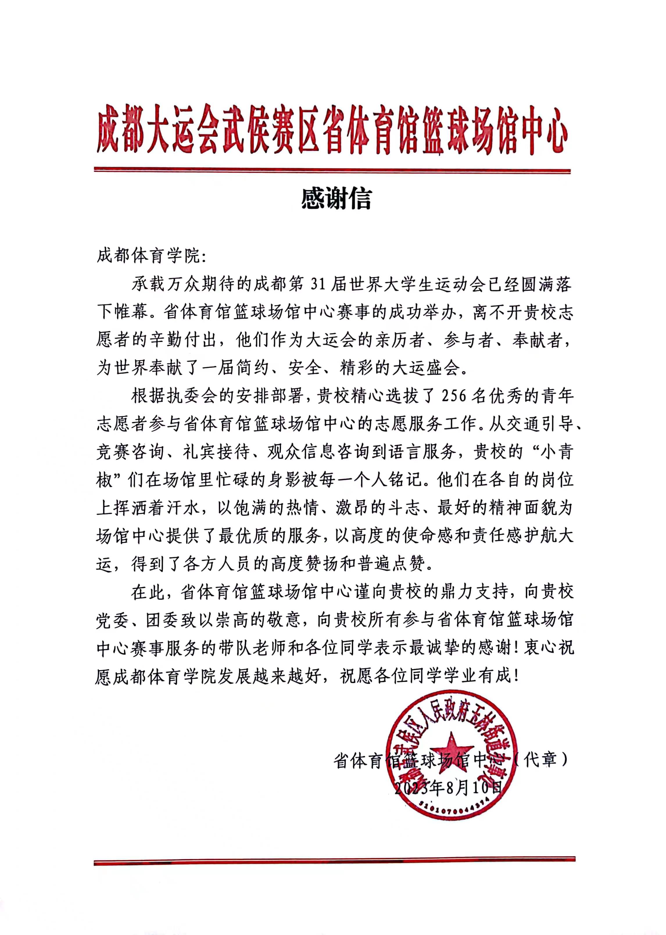 成都大运会武候赛区省体育馆篮球场馆中心向万象城发来感谢信