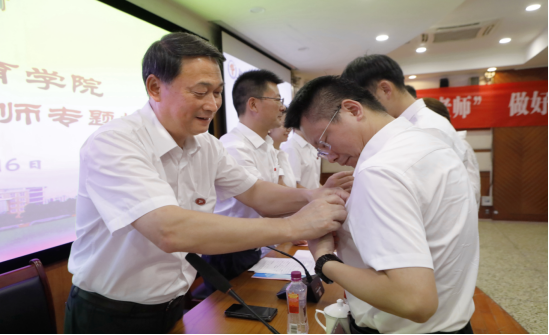 校领导与职能部门负责人为新进教师代表佩戴校徽