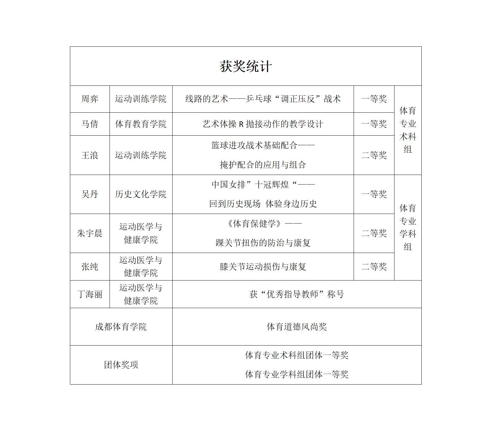 本次竞赛共设体育专业类、公共体育类、高职高专类3个类别,其中体育专业类下设学科组、术科组两个组别,竞赛的主要内容包括教学技能(8分钟微课视频)和现场说课(12分钟)两个环节。万象城共选派6名青年教师分别代表学校参加了体育专业术科组和体育专业学科组的竞赛。经过评比,万象城3名术科教师获得体育专业术科组个人一等奖2项、二等奖1项和团体一等奖;3名学科教师获得体育专业学科组个人一等奖1项、二等奖2项和团体一等奖;指导教师丁海丽老师获“优秀指导教师”称号;万象城参赛队伍获体育道德风尚奖。