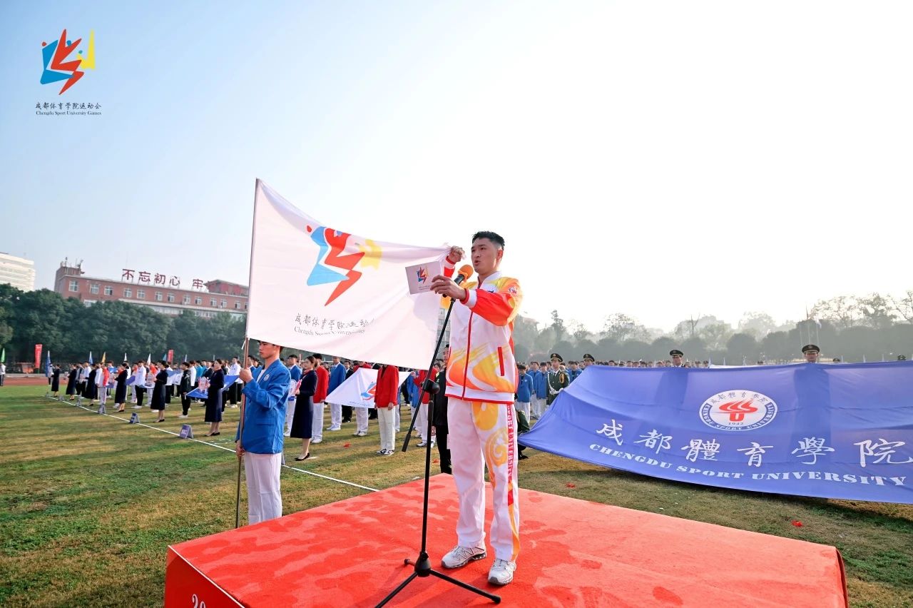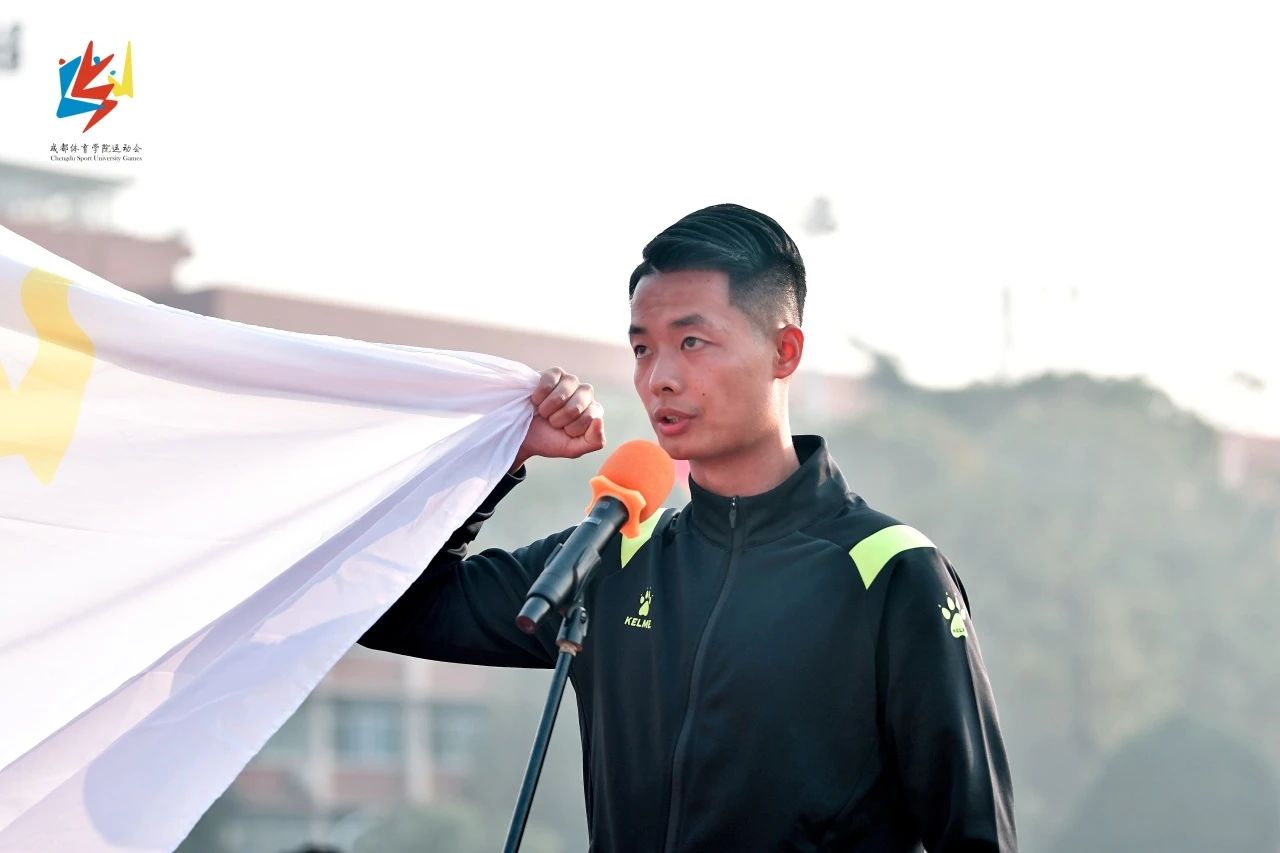 第6届、7届中国大学生武术散打锦标赛男子60kg级冠军、武术学院王子硕同学,中国足协现役国家级裁判员,中国足协职业联赛、中国足协杯裁判员、足球运动学院吴灿同学分别作为运动员和裁判员代表庄严宣誓。