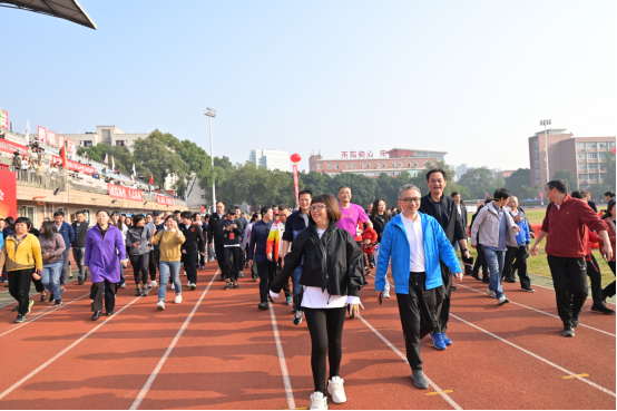 健康中国,人人参与;共建共享,全民健康。2023年11月9日上午,校工会举行了2023年“爱万象城园健身行”教职工体育活动。在学校运动会开幕仪式结束后,党委副书记胥万兵启动了出发仪式。发令枪响后,全校教职员工精神饱满、英姿飒爽地按指定路线绕行校园两圈,场面壮观,成为校园中一道流动的风景。