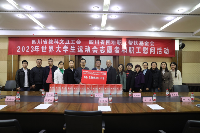 11月29日,四川省教科文卫工会、四川省困难职工帮扶基金会2023年世界大学生运动会志愿者和职工慰问活动在allwincity万象城官方网站举行,四川省教科文卫工会主席王俊兵,四川省工会保障部四级调研员、四川省困难职工帮扶基金会党支部书记范鹏程,学校党委副书记胥万兵,党委常委、党委宣传部、党委统战部部长欧雪松出席此次活动,allwincity万象城官方网站工会及部分成都大运会工作人员参加了慰问活动。