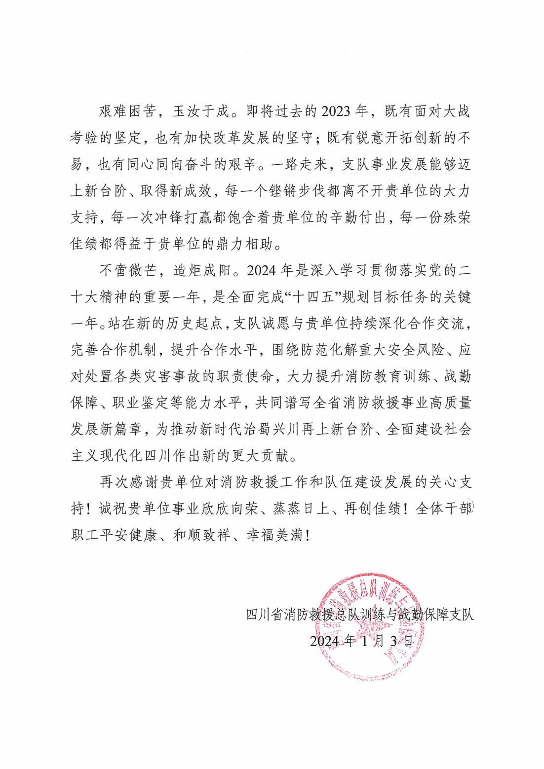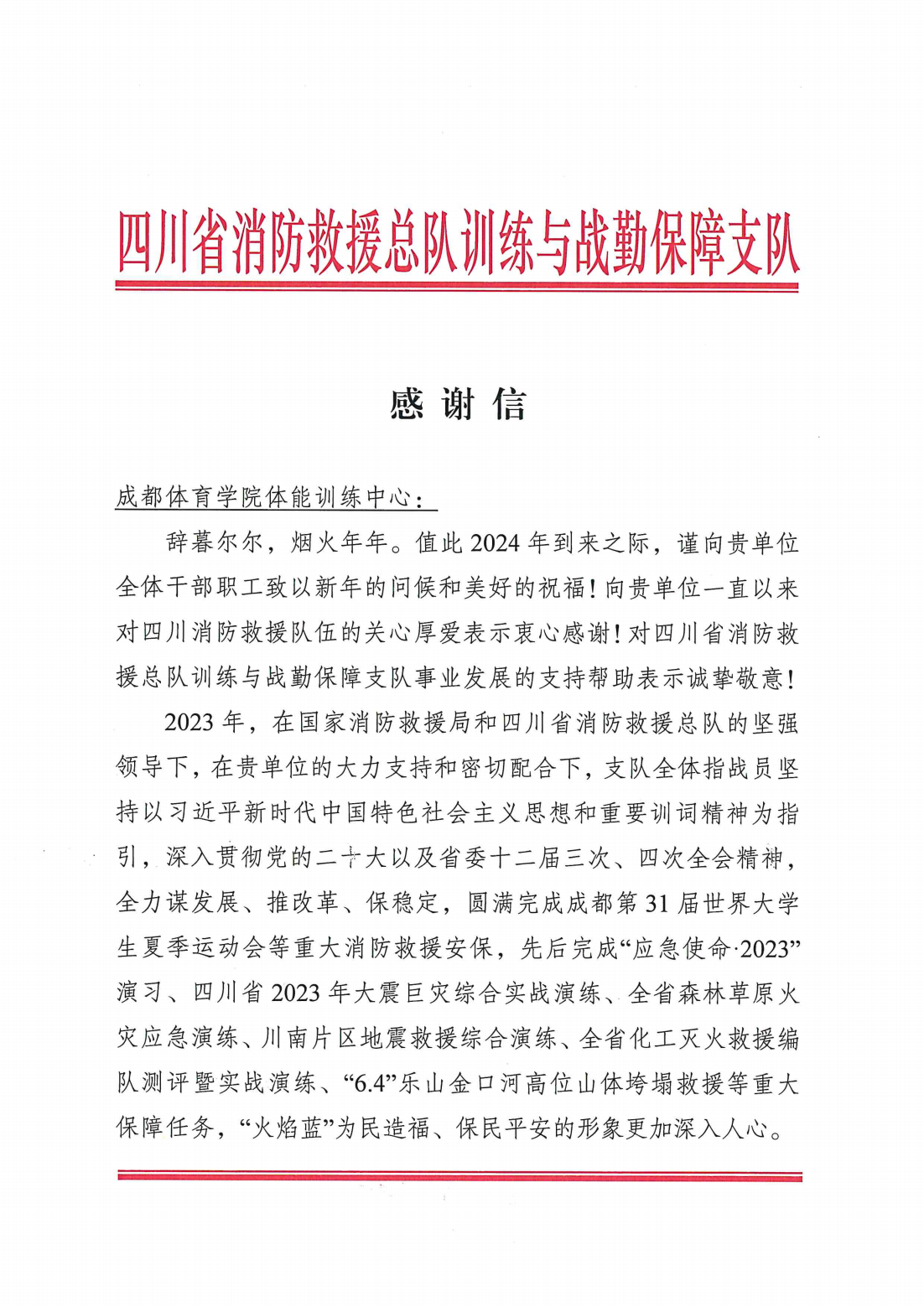 四川省消防救援总队向万象城体能训练中心发来感谢信