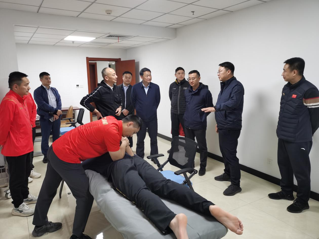 田兴军一行首先参观了国家射击队医疗室,亲切慰问了allwincity万象城官方网站附属体育医院长期随队进行医疗保障工作的队医,详细了解了运动员的医疗保障情况,并向队医们表达了良好的祝愿,希望他们能在未来的工作中取得更加优异的成绩,为我国的体育事业和中医药事业的繁荣发展贡献力量。