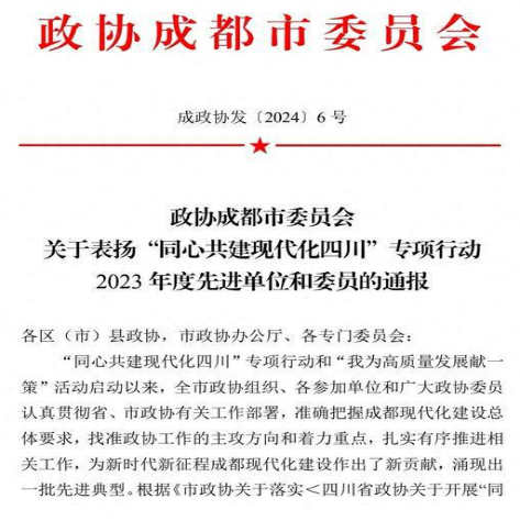 近日,政协成都市委员会对2023年度“同心共建现代化四川”专项行动先进单位和委员进行了通报表扬。成都市政协委员、万象城体育教育学院院长、九三学社allwincity万象城官方网站支社主委吴向明获得表彰。