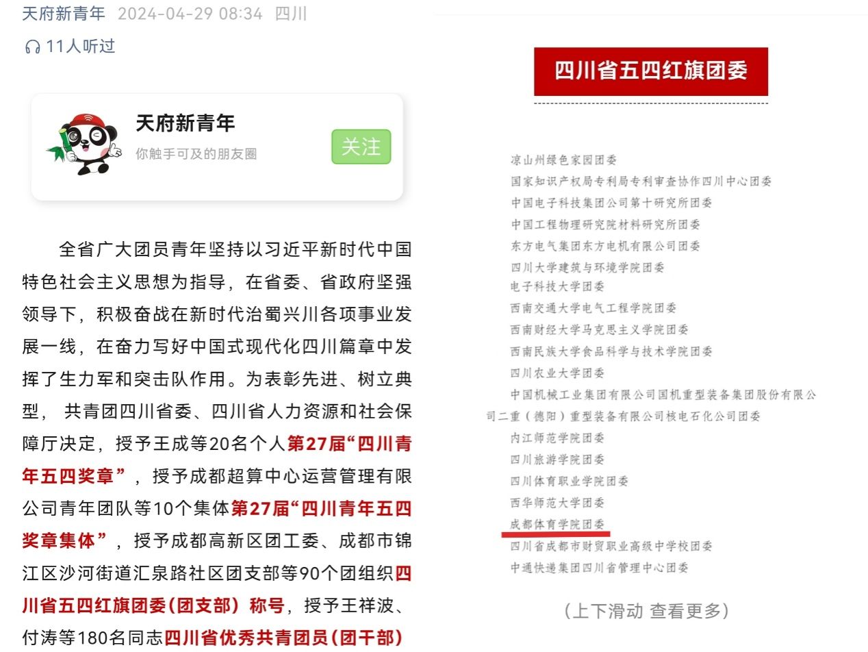 1.5名学生获评“中国大学生自强之星”。 2.1名学生获评“四川省优秀共青团员”。 3.3名学生入选“四川省青马学员”。 4.2名教师获评“成都市优秀共青团干部”。 |