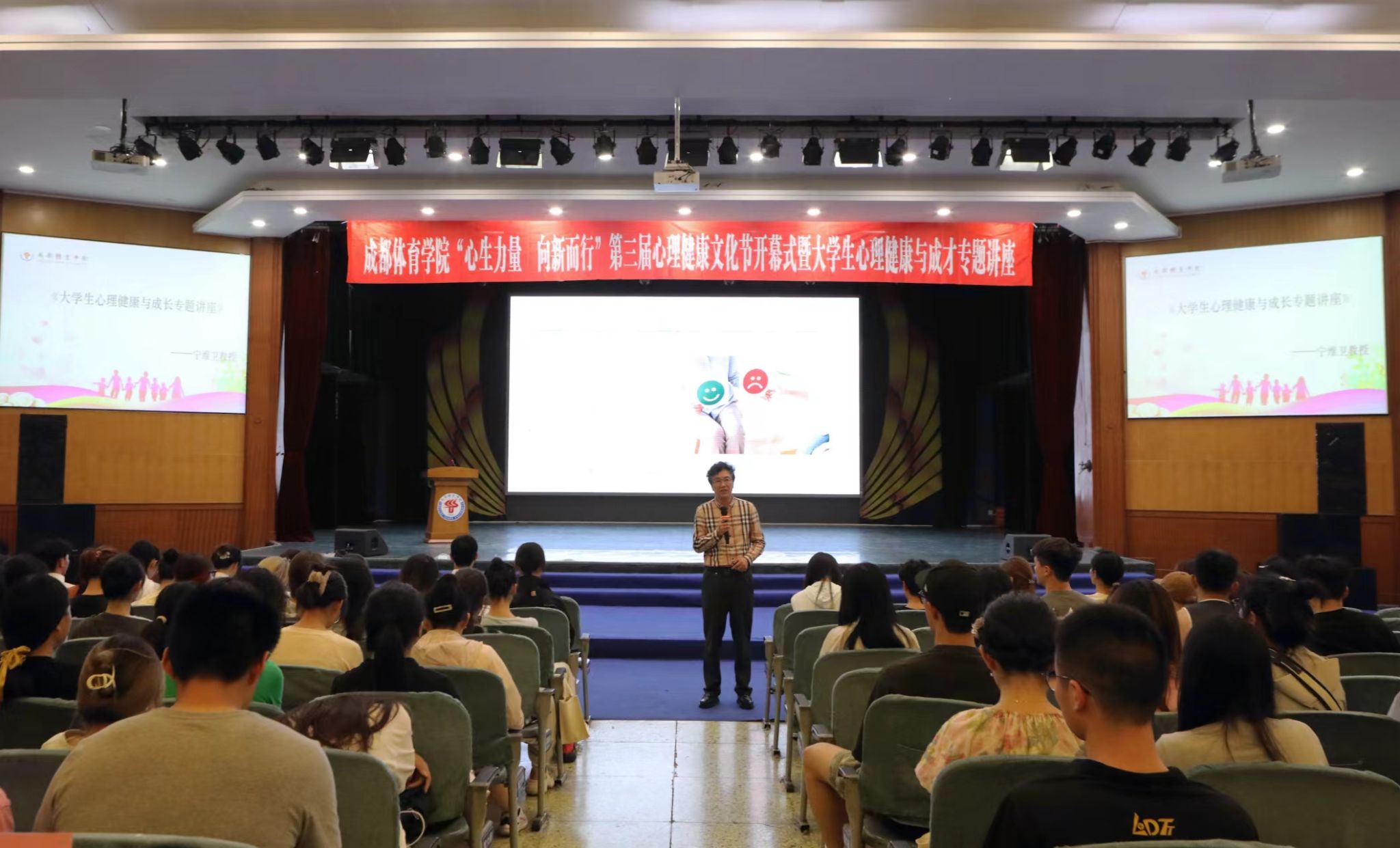 开幕式后,宁维卫教授给师生开展了“大学生心理健康与成才”专题讲座。宁教授用专业、贴近学生的方式深入浅出地讲解了当前大学生面临的心理问题及应对方法,强调在学生心理成长的过程中要学会处理好与老师、同学及电脑的三种关系,提出了三种心理期待,倡导大家要拥有“自信心、责任心、进取心、爱心”和“阳光、坚韧、创造、感恩”精神。此次讲座对成体学子保持积极健康的心态,学会打破思维定势,培养健全人格,增强自身魅力具有重要指导意义。