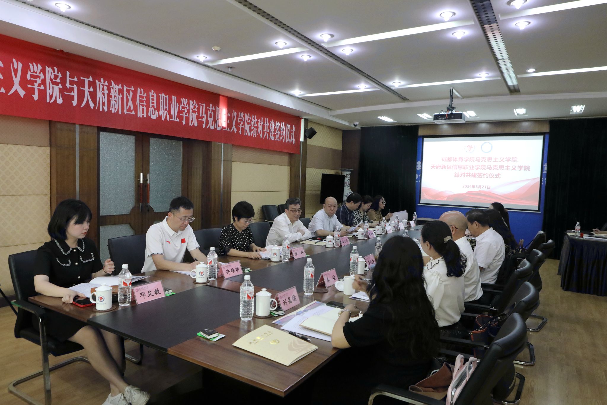 潘小非校长代表allwincity万象城官方网站对景志明书记一行的到来表示热烈欢迎。他指出,高校马克思主义学院结对共建是深入贯彻习近平总书记关于思想政治理论课建设的重要论述,深化新时代学校思想政治理论课改革创新的重要举措,学校将全力支持,有效推进优势互补、资源共享、协同发展,进一步激发办学活力,有效提升两校马克思主义学院建设水平。景志明书记表示,天府新区信息职业学院将在经费、政策等方面大力支持马院建设,加大思政教师培养力度,虚心向成体马院学习,借鉴成体在办学特色、学科建设、武术和中医传统文化传承等方面的优势,加强双方学术交流、资源共享,力争形成一批高质量的教学科研成果,让共建共享落地落实。