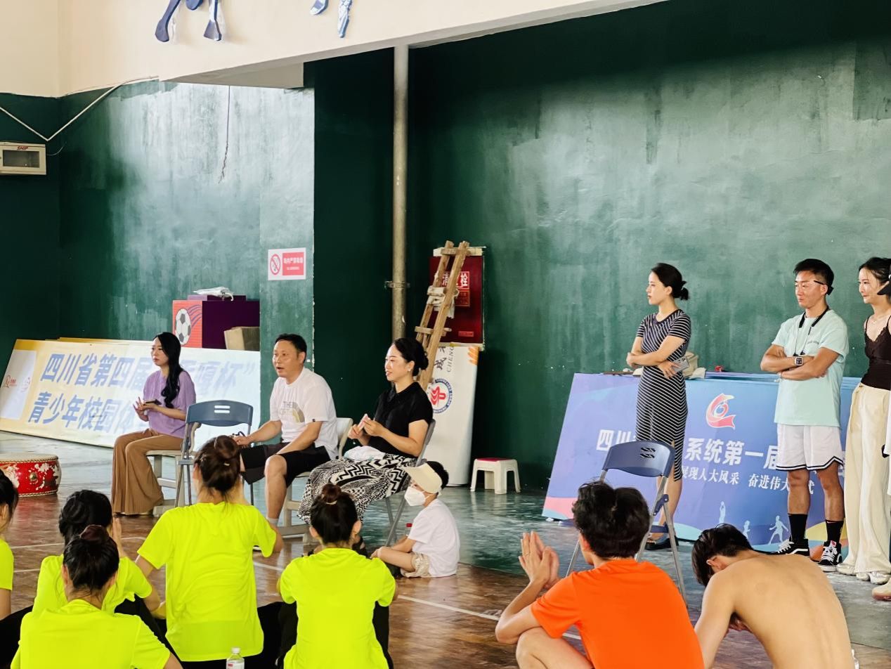 中华人民共和国第十二届少数民族传统体育运动会(以下简称:第十二届全国民族运动会)四川省代表团表演项目于7月18—8月14日组织进行了第二阶段排练工作。8月14日中午,艺术学院领导班子及项目负责人就第十二届全国民族运动会四川省代表团表演项目第二阶段的完成情况在武侯校区球类馆进行检查。
