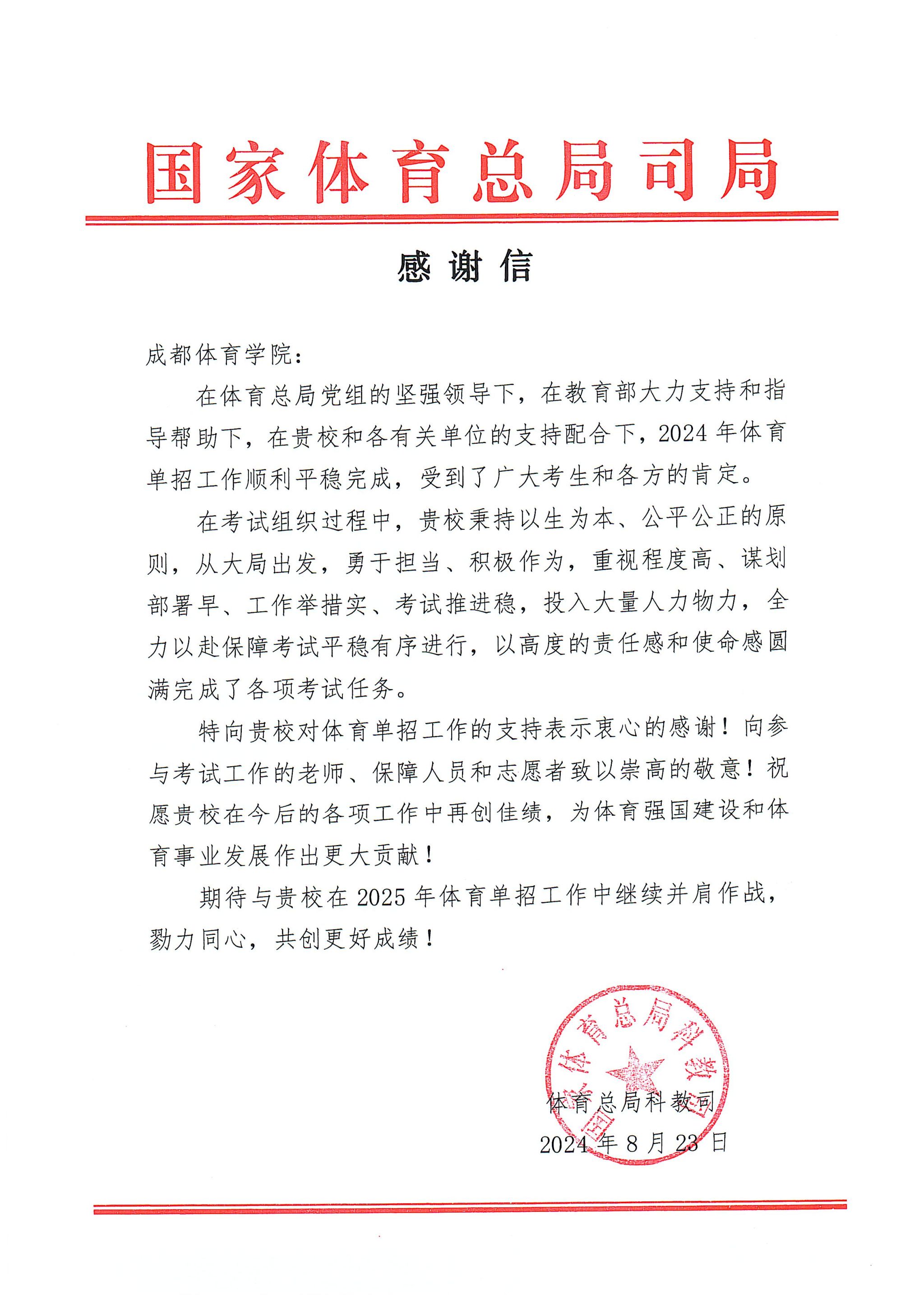 国家体育总局科教司向万象城发来感谢信