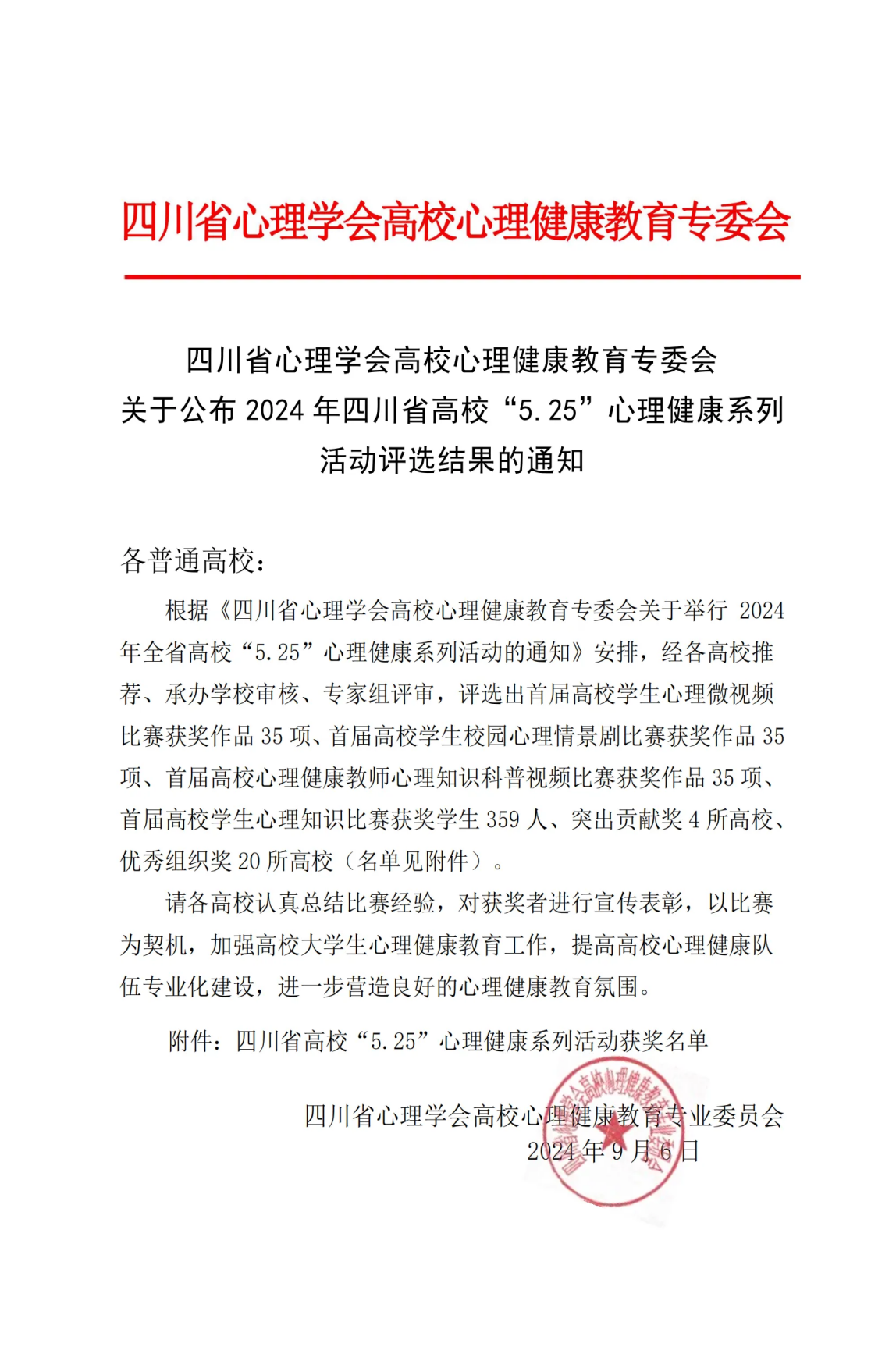 近日,四川省心理学会高校心理健康教育专委会公布了2024年四川省高校“5.25”心理健康系列活动评选结果,由王玥、孙权宇、刘霞老师指导的作品《心声的力量》在四川省首届高校学生校园心理情景剧比赛中荣获三等奖。经济管理学院2023级吴慧旻同学获全省首届高校学生心理知识比赛优秀奖。