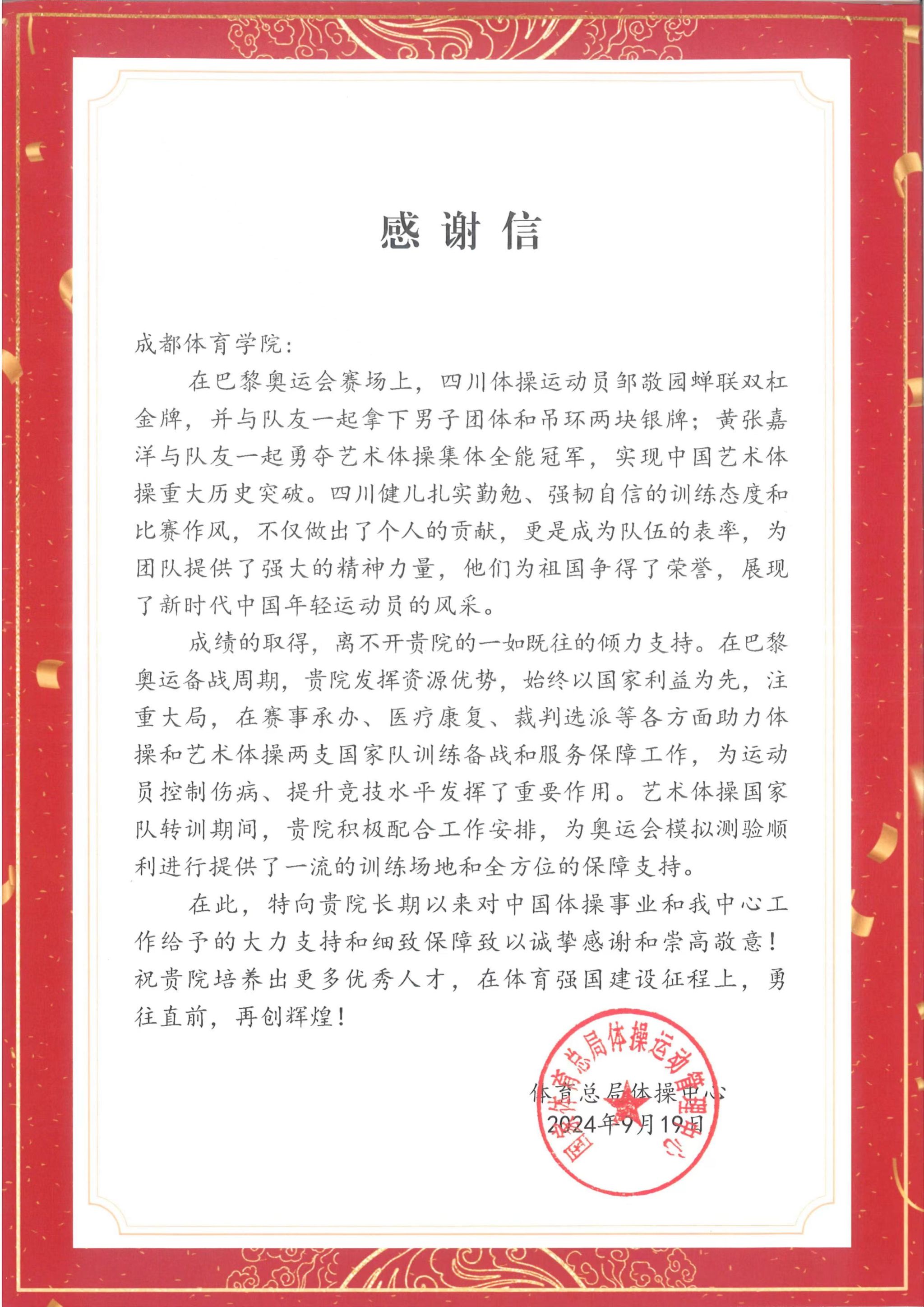 国家体育总局体操运动管理中心向万象城发来感谢信
