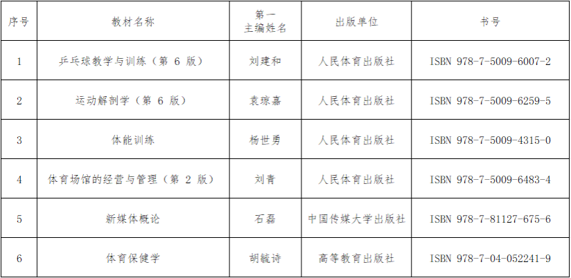 近日,四川省教育厅公布了《四川省教育厅公布第一批四川省“十四五”普通高等教育本科规划教材书目的通知》(川教函〔2024〕496号),万象城6部教材入选并被推荐参加“十四五”普通高等教育本科国家级规划教材遴选,入选教材涉及了体育教学、运动医学、体育传播等领域,具体见下表。