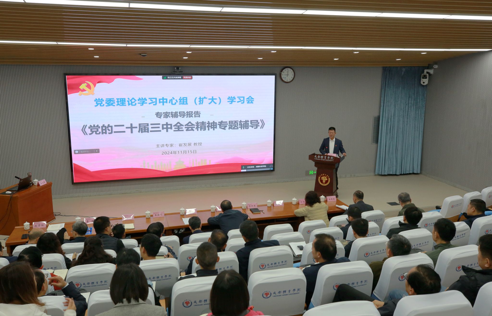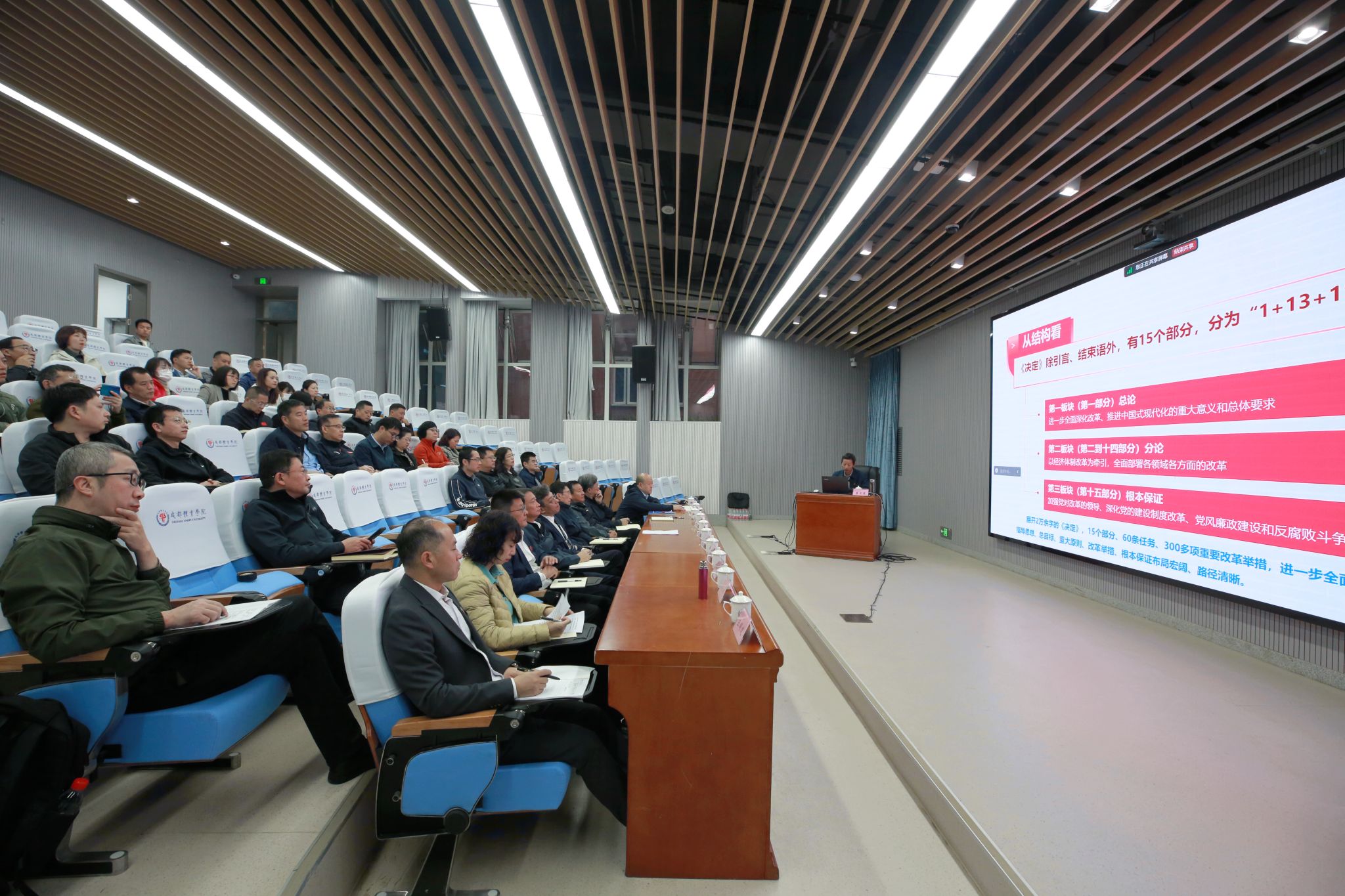 会议特邀四川省委宣讲团成员、西南石油大学马克思主义学院院长崔发展教授作党的二十届三中全会精神专题辅导报告。崔教授从深刻把握党的二十届三中全会的重大意义、深刻把握党的二十届二中全会以来党和国家事业取得的重大成就、深刻把握进一步全面深化改革的总体要求、深刻把握进一步全面深化改革的重大举措、深刻把握抓好全会精神贯彻落实的基本要求等五个方面全面解读党的二十届三中全会精神。