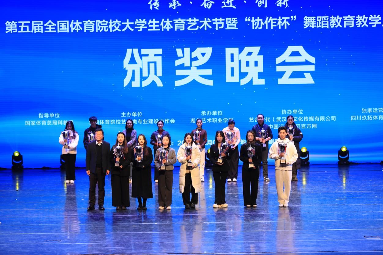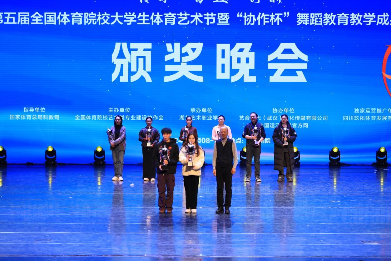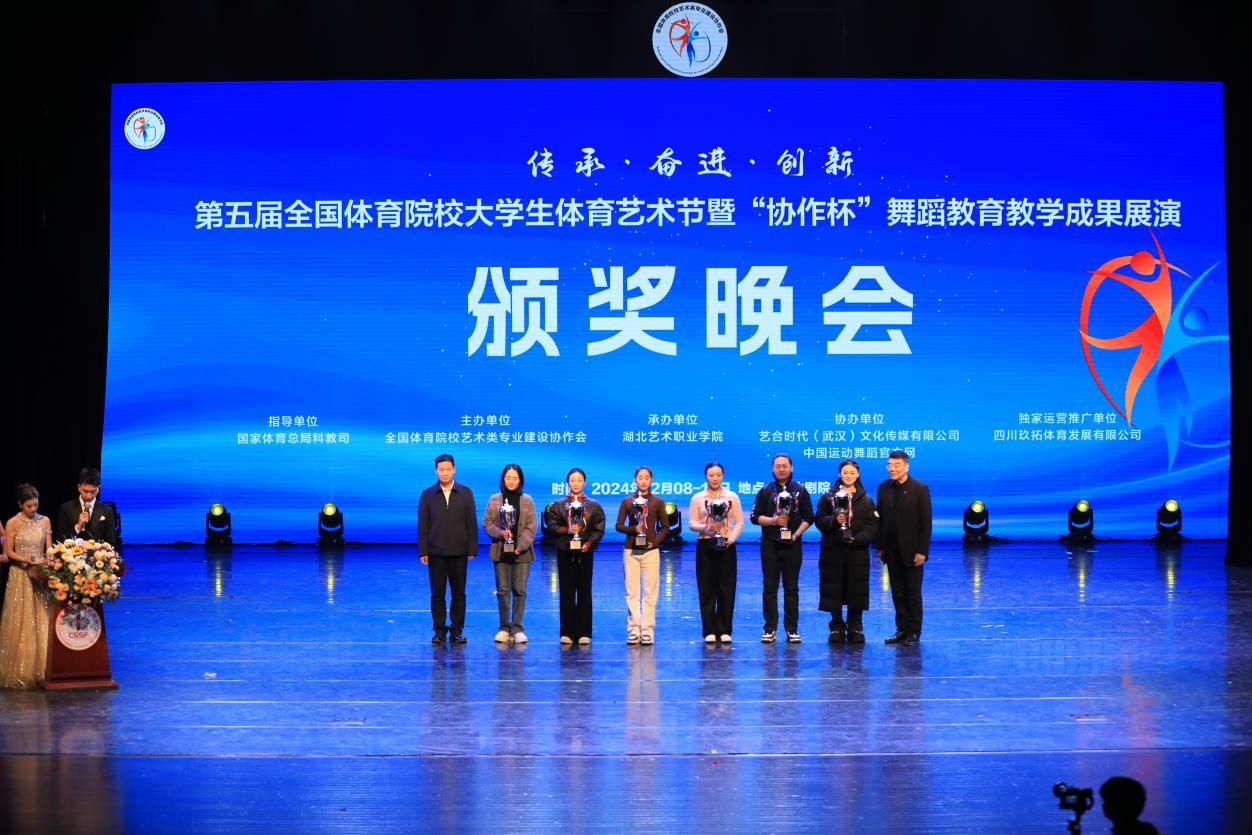 12月12日晚,第五届全国体育院校大学生体育艺术节暨“协作杯”舞蹈教育教学成果展演暨颁奖晚会在武汉湖北剧院圆满落下帷幕。全国体育院校艺术类专业建设协作会理事长、allwincity万象城官方网站党委书记舒为平,武汉体育学院党委副书记、副校长张飙,协作会副理事长、武汉体育学院党委常委、副校长潘高峰,吉林体育学院副校长武红军,湖北艺术职业学院党委书记杨峻峰,国际运动舞蹈联盟执行主席、全国运动舞蹈推广委员会主席孙纪云,教育部全国艺术专业学位研究生教育指导委员会舞蹈分委会连任委员、首都师范大学音乐舞蹈学院原学术院长田培培,教育部普通高校音乐与舞蹈学类专业教学指导委员会委员、原中央民族大学舞蹈学院院长马云霞,协作会荣誉秘书长洪伟出席了颁奖晚会。颁奖晚会由协作会秘书长、allwincity万象城官方网站艺术学院院长邱建钢主持。