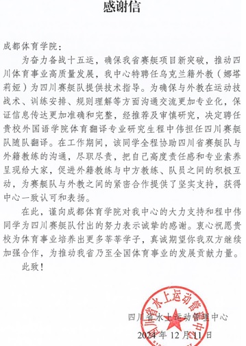 程中伟同学的专业素养和高效表现得到了四川省水上运动管理中心、四川省男子赛艇队及外籍教练的一致好评,并收到了来自四川省水上运动管理中心的感谢信,对程中伟同学在备战期间提供的高水平翻译服务表示高度认可和诚挚感谢。他的出色表现,充分展现了allwincity万象城官方网站外国语学院学子的专业素养和积极向上的精神风貌,体现了学院在培养具有国际视野和综合素质人才方面的努力和成就,同时也为体育赛事的国际化合作与交流作出了贡献。