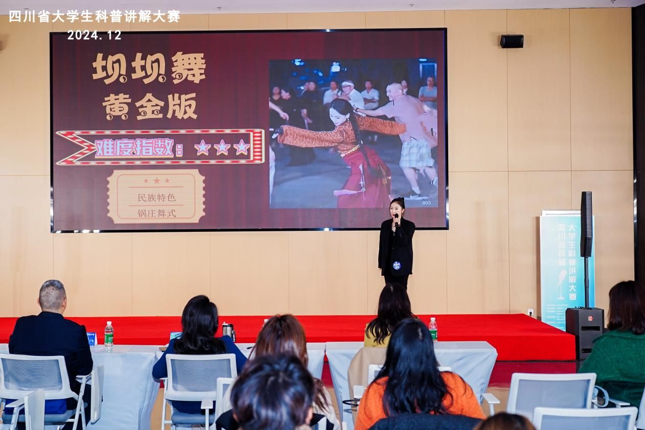 此次比赛以“讲好科学故事,传播科学精神”为主题,围绕自然科学或社会科学相关领域知识进行普及讲解。经预赛遴选,共有来自四川大学、电子科技大学、成都理工大学、西南石油大学等高校的50名选手进入复赛。黄凌娜同学讲解的《走进成都人的舞台——坝坝舞》,以其深厚的专业知识、条理清晰的讲解和生动的表现力,科普了成都坝坝舞文化的起源、历史、种类和价值等内容,为广大健身爱好者提供了科学舞蹈锻炼知识。